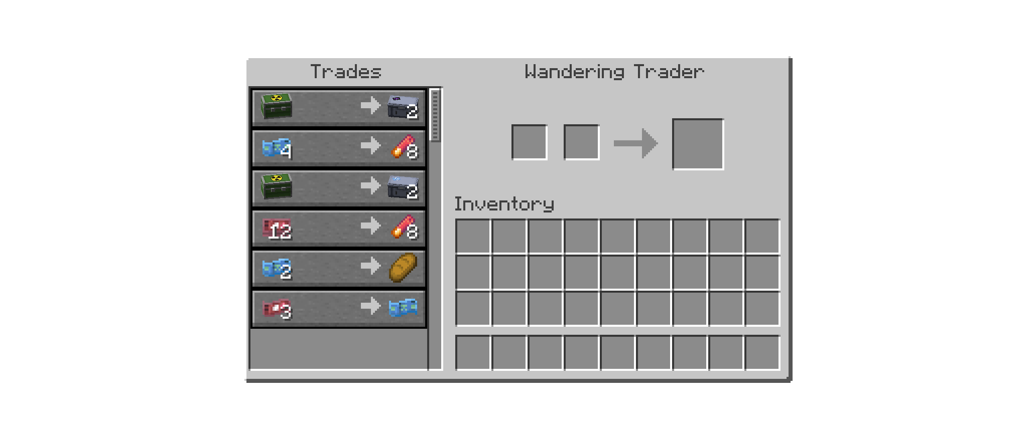 Wandering Traders now spawn every in-game day without llamas nearby a random player and offer various items, currency exchange, and supply cases.